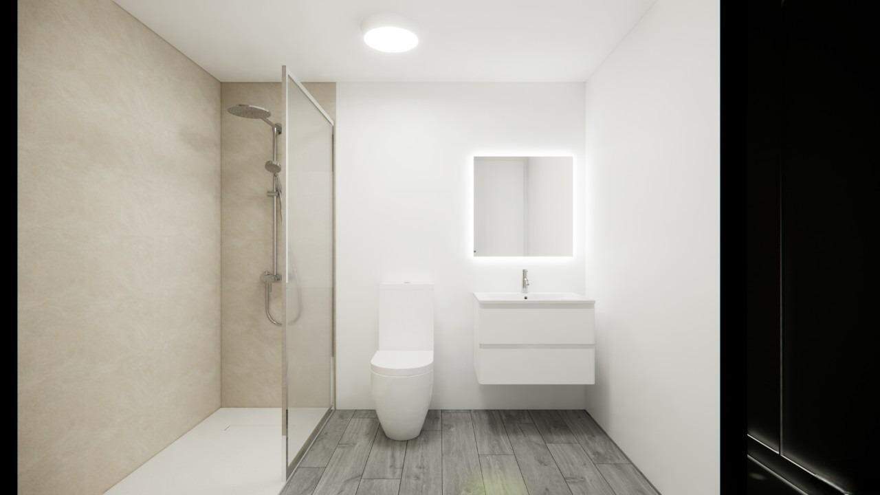 Contemporary bathrooms complete with furniture, mirrors, and shower screens
