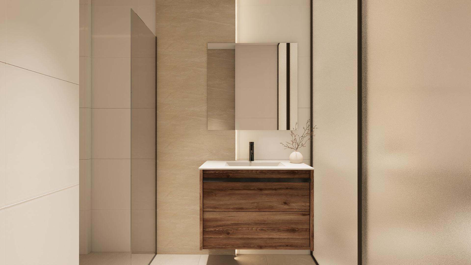 Every apartment features two bedrooms and two bathrooms, one of them en suite, as well as a private parking space in the underground garage. The properties are built with high quality materials and modern finishes that ensure both energy efficiency and long term durability. They include pre installation for ducted air conditioning, aluminium exterior carpentry with double glazing and motorized shutters, and a reinforced security entrance door for added peace of mind. An aerothermal system provides efficient hot water production, while built in wardrobes in all bedrooms and fully equipped bathrooms with furniture and shower screens enhance everyday comfort and practicality.