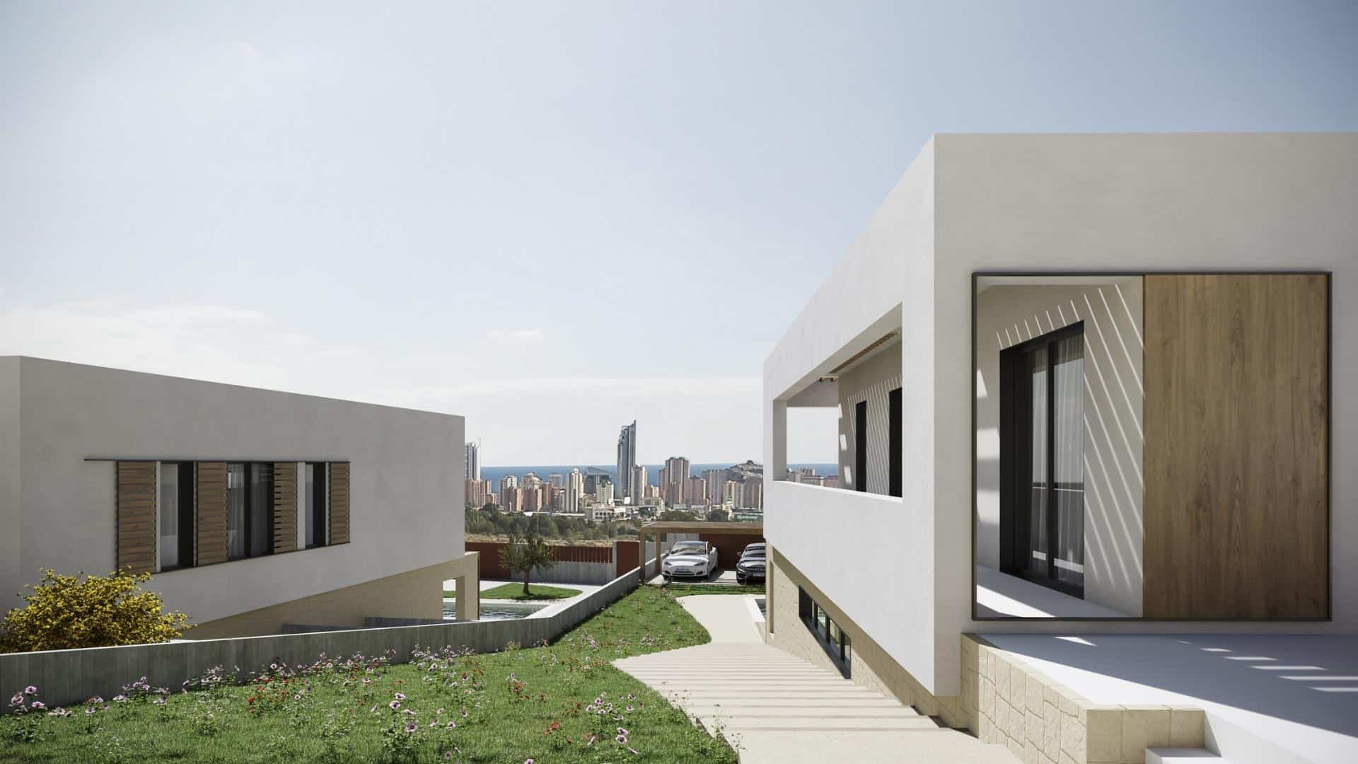 The villas are thoughtfully conceived as fully walkable homes, with interior and exterior pathways providing independent access to each level. This unique layout enhances both functionality and privacy while offering a variety of perspectives across the architectural design and its natural setting. From the terraces, residents can enjoy magnificent views stretching over Benidorm, the Mediterranean Sea, and the scenic landscape of Sierra Cortina.