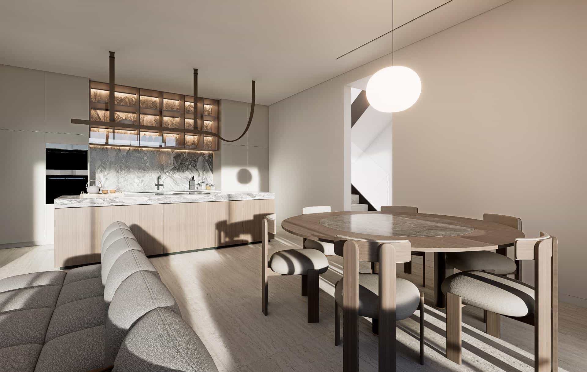 The ground floor boasts an open-plan kitchen seamlessly connected to the living room, two bedrooms, and direct access to a generous terrace featuring a beautifully landscaped garden and a private 60 m² swimming pool.