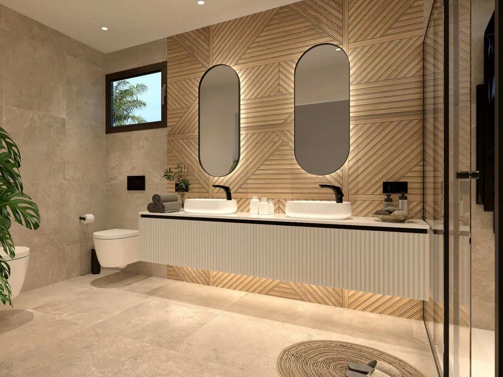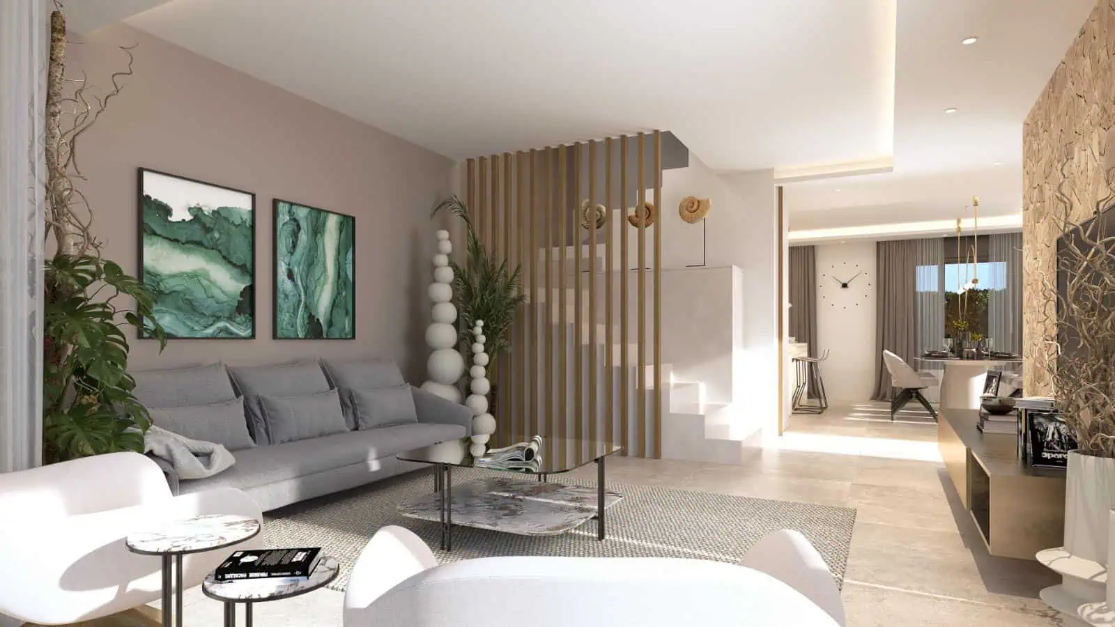 Each villa is set on a private plot of approximately 300 m² and offers around 140 m² of beautifully designed living space distributed over two floors. The properties feature three spacious double bedrooms, two full bathrooms with double sinks including an en suite, as well as an additional guest toilet. The ground floor presents a bright and elegant living area enhanced by a striking natural stone feature wall, creating a warm and sophisticated atmosphere. Large windows allow natural light to flood the space while providing direct access to the outdoor terrace and private swimming pool, complete with decorative water features.