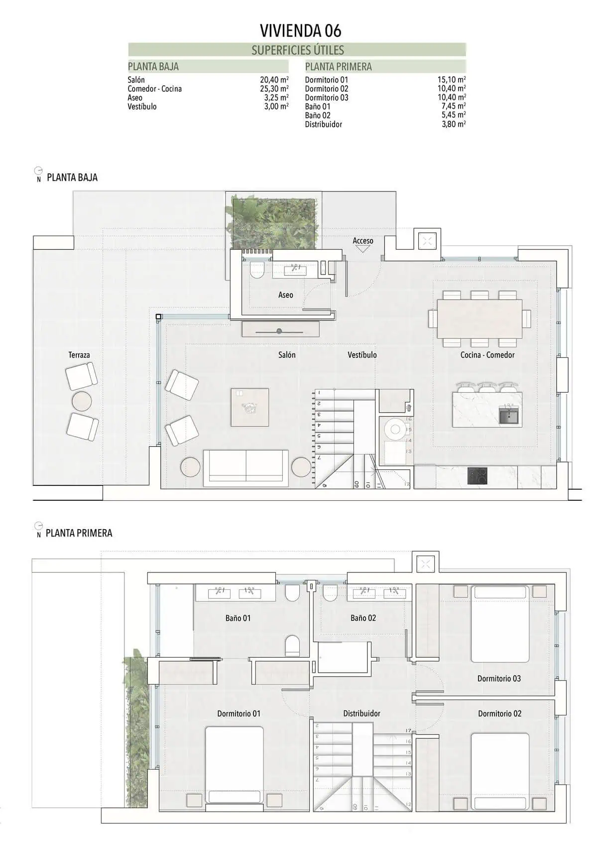Built using high-quality materials and incorporating the latest technology, these villas are designed to ensure maximum comfort and energy efficiency. They include pre-installation for ducted air conditioning, an aerothermal system for hot water, underfloor heating in the bathrooms, and electric shutters. For added convenience and security, each property is also equipped with an alarm system, video intercom, and an automated vehicle access gate, making these homes a perfect blend of modern living and peace of mind.