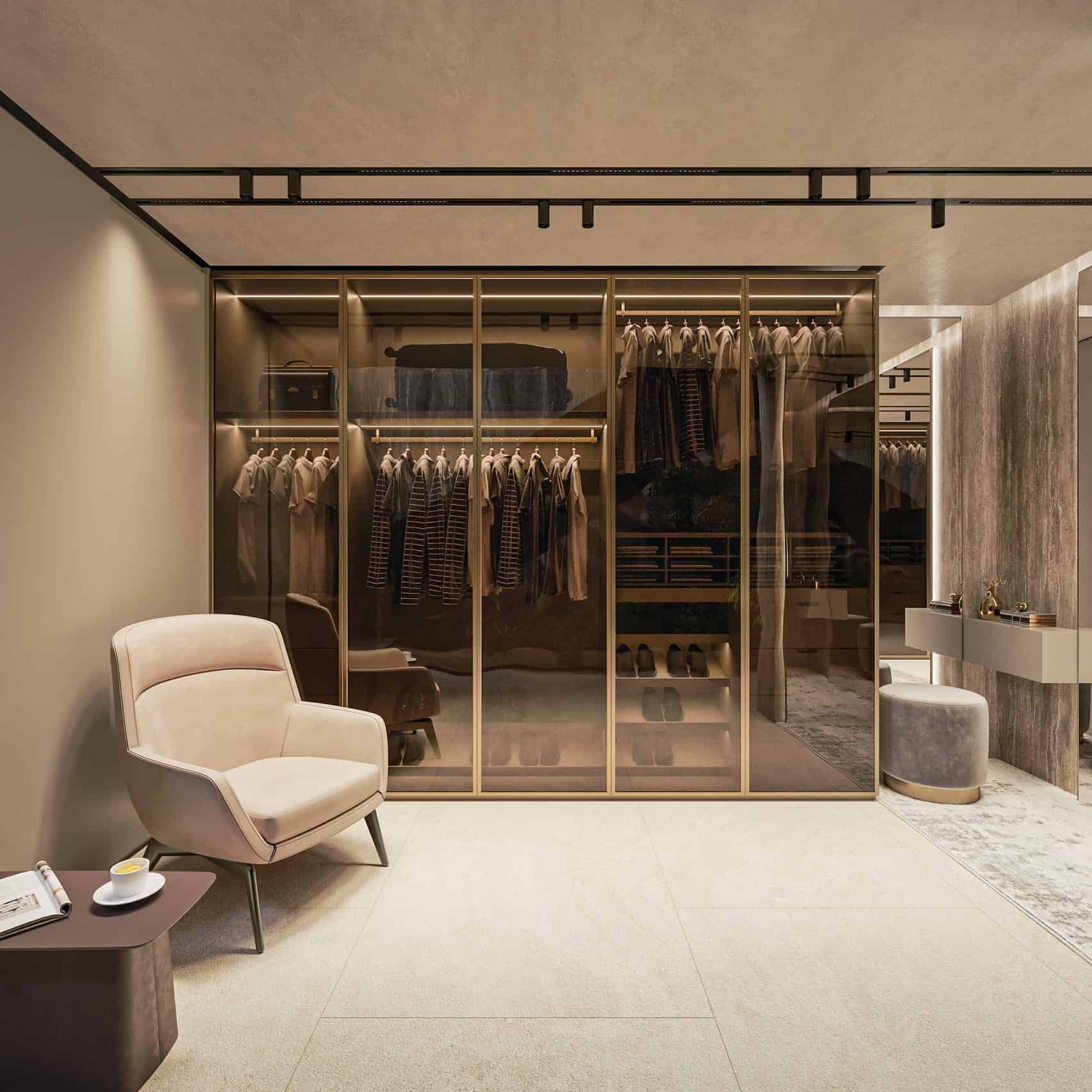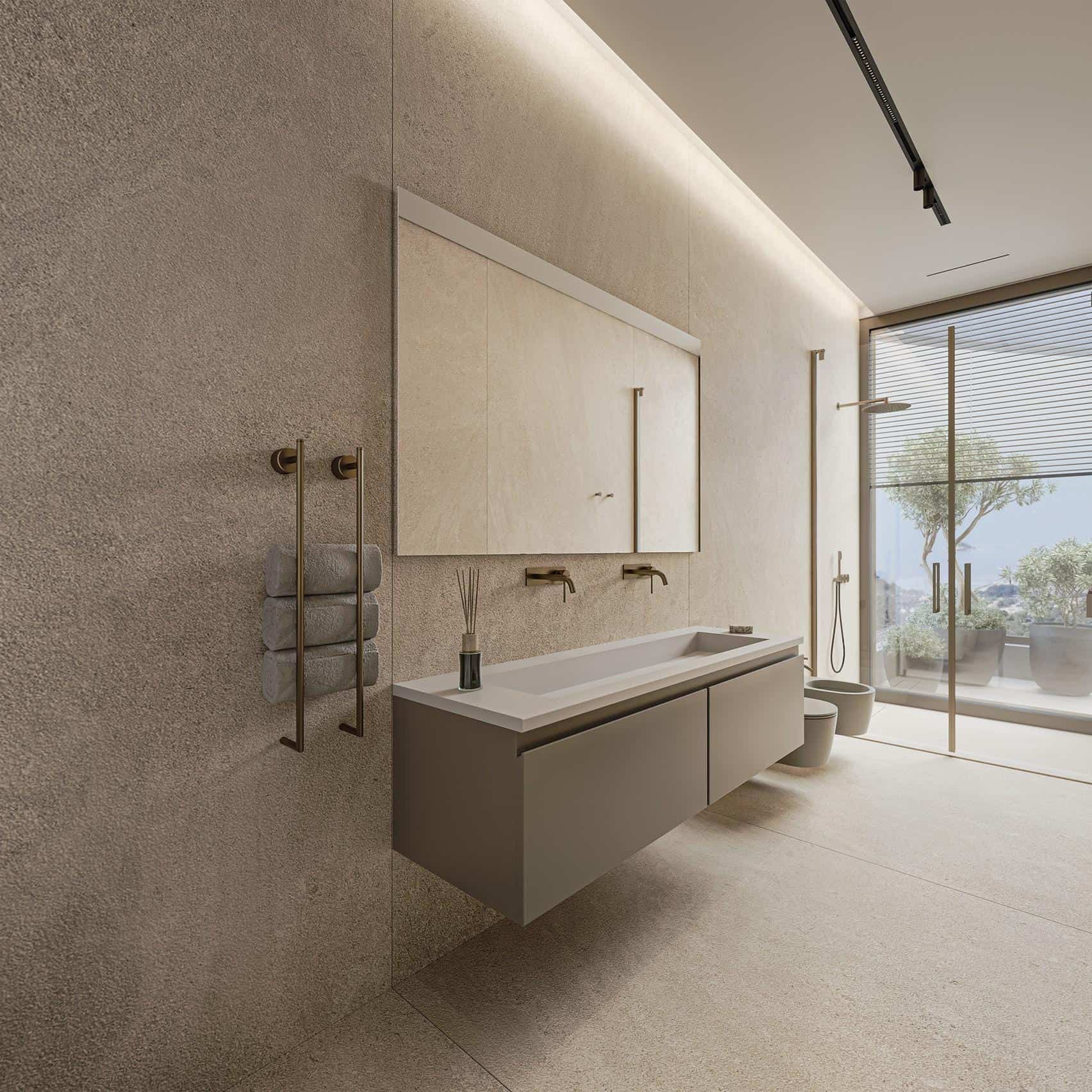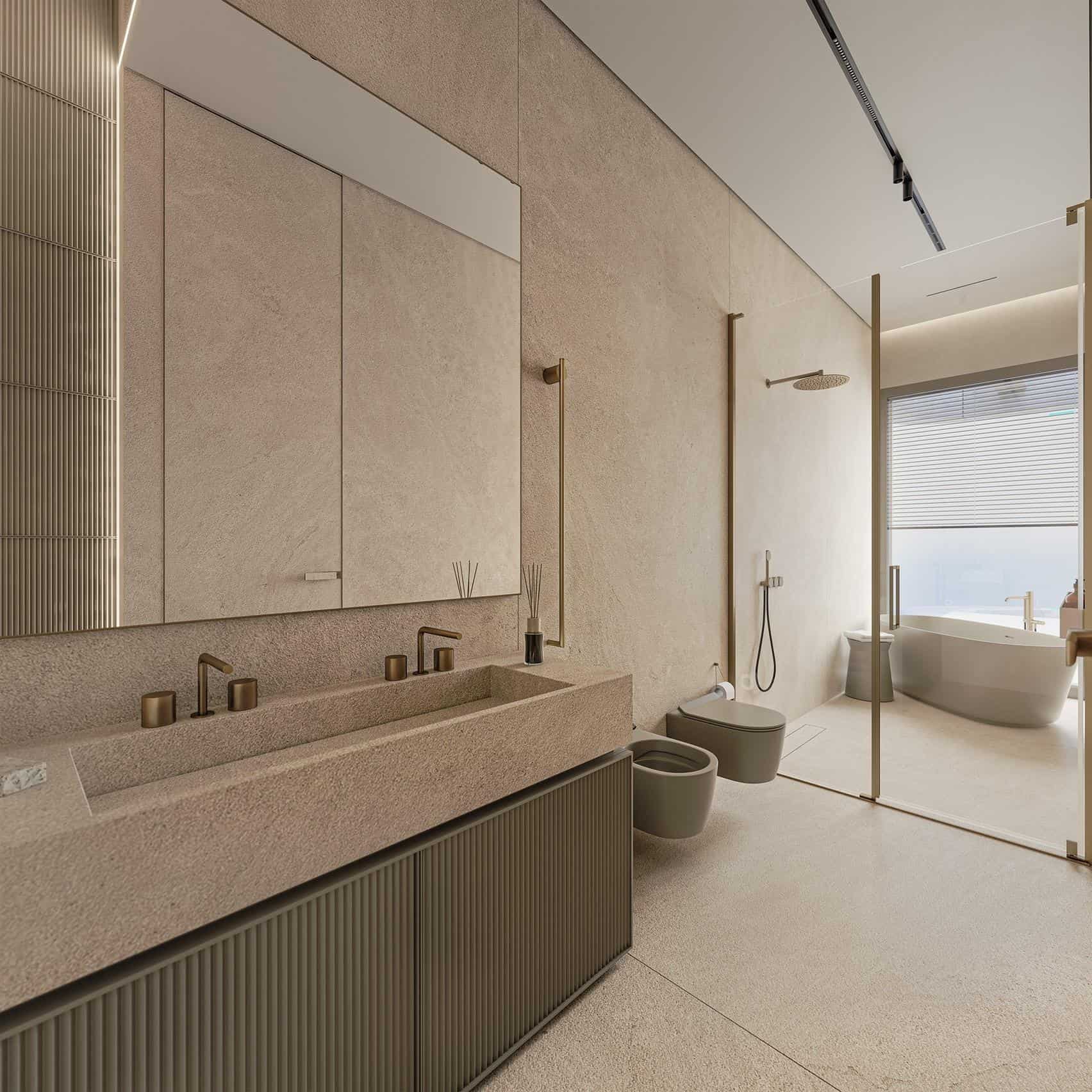 The villa features four spacious bedroom suites, each with its own en-suite bathroom and direct access to terraces. Every room has been thoughtfully designed as a private retreat, finished with high-quality materials and attention to detail. The master suite is particularly impressive, offering a walk-in wardrobe and a luxurious bathroom with a freestanding bathtub overlooking the sea, evoking the ambiance of an exclusive spa.